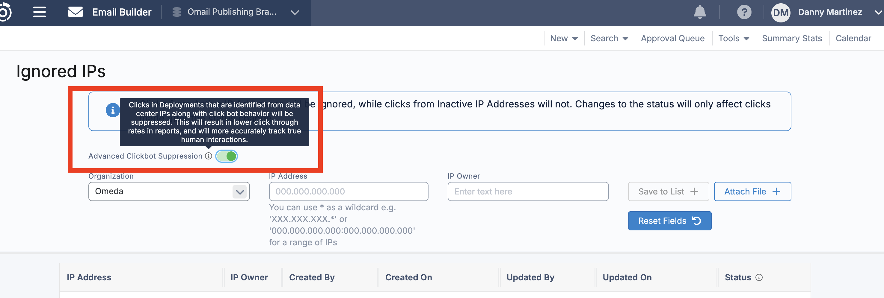 When enabled, Advanced Clickbot Suppression filters out clicks originating from known data center IP ranges, in addition to Omeda’s existing behavior-based clickbot detection. While clicks from these IPs remain visible in the Clickbot Detail Report, enabling this feature to excludes them from standard click metrics, helping to more accurately reflect true human interaction. This does not prevent traffic or stop clicks from occurring.