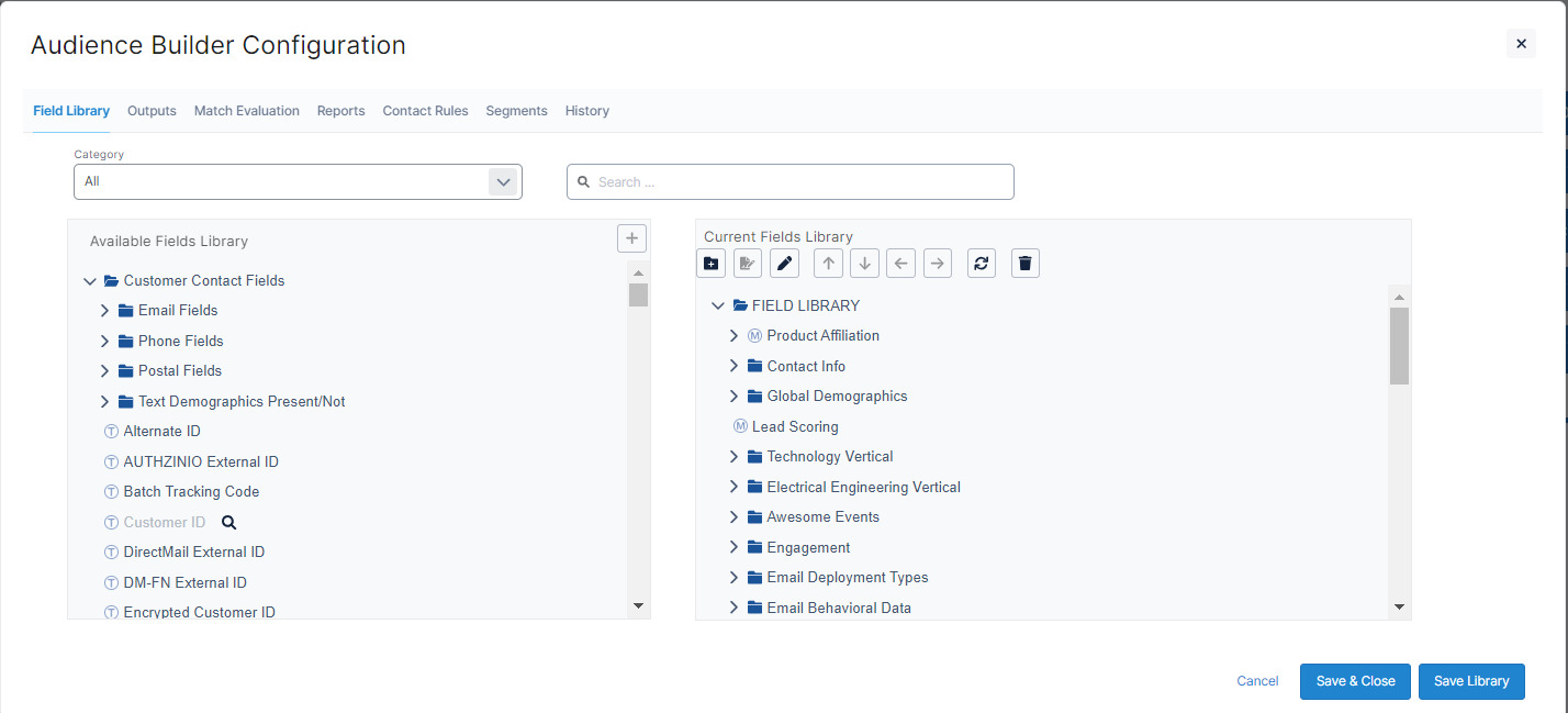 Configure which fields to display and in what order in the Audience Builder Library (displayed on the Left Hand Side of the Audience Builder query screen)