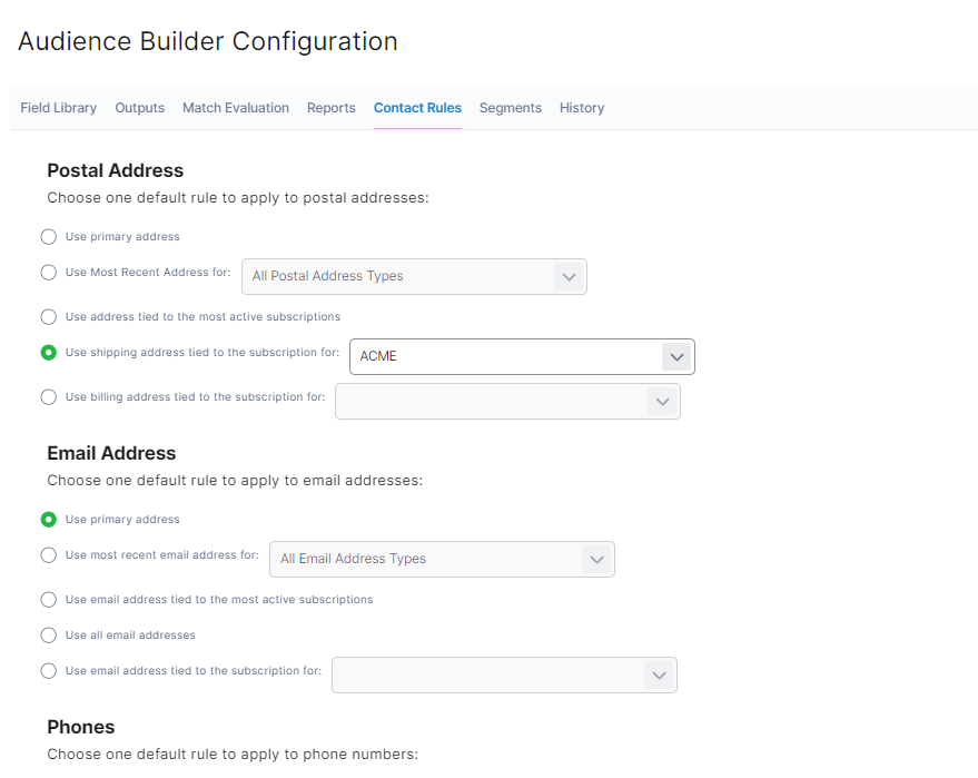 In the Audience Builder Configuration menu, click the Contact Rules tab. Select the Contact Rules you’d like to use as a default. Only the ones selected in the Profile Settings page will be available.