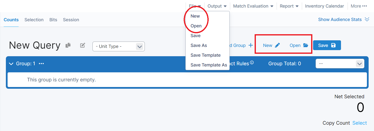 When you start Audience Builder, a new query will be automatically created. You can work on this query or open an existing query. To open a previously saved query, use the Query menu or click on the Open link in the query window. Clicking on new will start a new query.