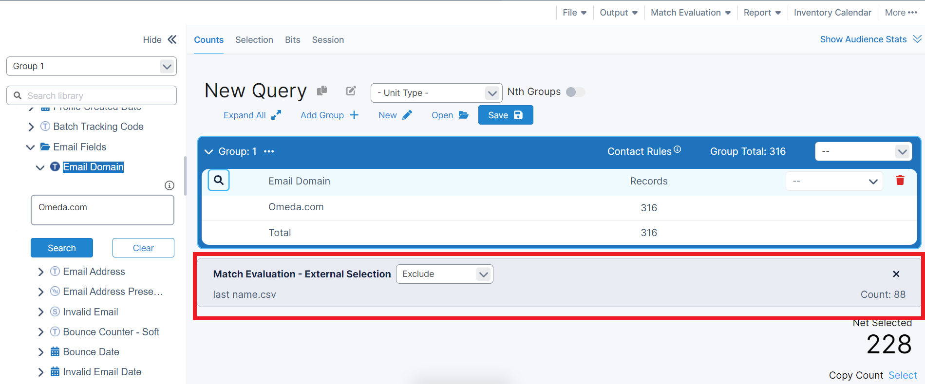 Match Evaluation gives you the ability to compare your query with another Audience Builder query (internal selection) or with a list of people (external CSV file). For example, if you purchase a list of people to which you want to promote a newsletter, you can find out how many people on the list already receive the newsletter by comparing the list to a query of the current newsletter recipients. To use match evaluation, create your query and then use the Match Evaluation menu to select an Internal Selection (Audience Builder query) or an External CSV File.
