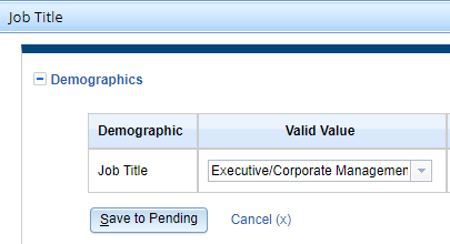 Make the new demographic value. Click the Save to Pending button or press Alt-s. If you want to cancel your changes, click Cancel (x) or press Alt-x.