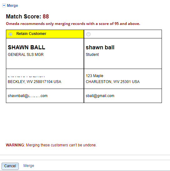 Once the two customers are matched, we will display their contact information for you to compare with. There is a match score at the top and we show the customer we recommend as the winning customer. Normally, you would only consider merging the customers if the score is 95 and above. The higher the score, the likelier they are duplicates. You may select the other customer as the winner. Remember, a merge cannot be undone. Once you’ve selected the winning customer and decide to merge them, click the Merge button. This will merge all of the loser’s information to the winning customer and then the loser customer will be deactivated. If you don’t want to merge them, click the Cancel button.