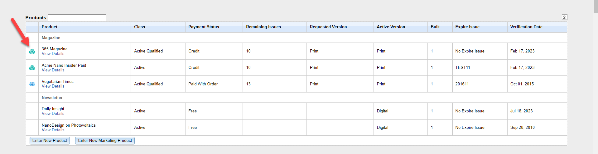 To navigate to the Product section. In the main Product table, we list the customer’s magazine and newsletter subscriptions.