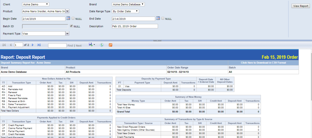 A deposit report will give you a breakdown of all the paid orders entered by either a batch or by a date range. The deposit report will show all orders with payment as well as all bill me/credit orders.