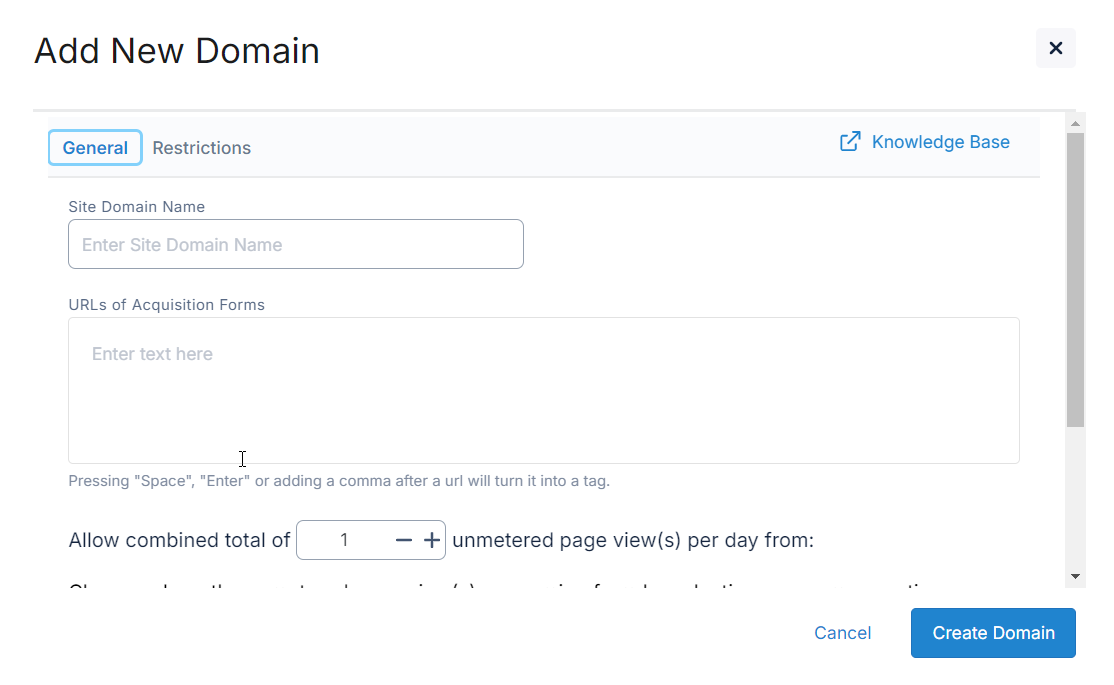 Site Domain: This is the domain where your meter will be applied. The value here will include the sub-domain; for example, if I wanted to create a meter for http://omeda.com and http://main.omeda.com , then I need a site domain for http://omeda.com and another site domain for sub-domain http://main.omeda.com .