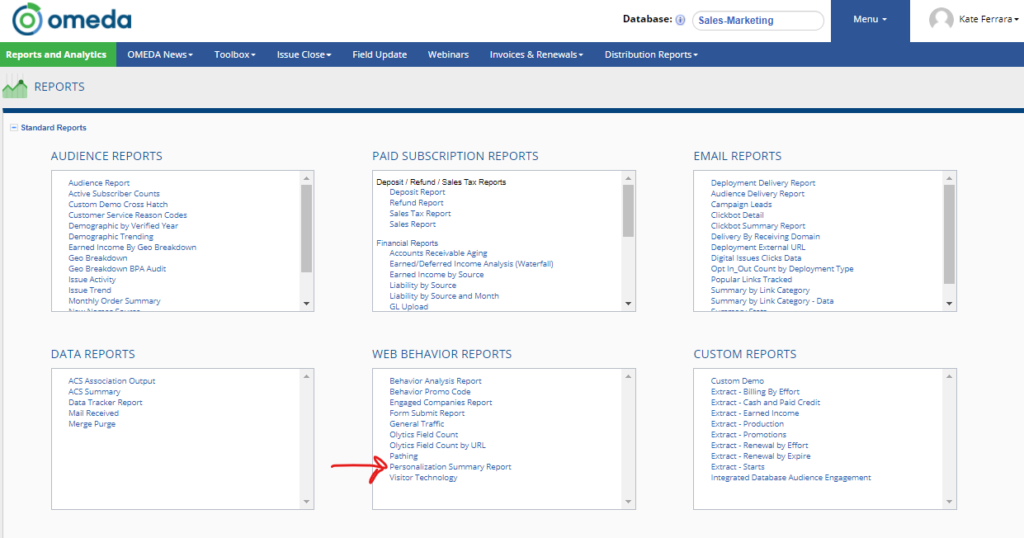 The report is located under the Web Behavior Reports on the Reporting and Analytics page of Omeda’s platform. You may need to contact your Client Success Manager to gain access.
