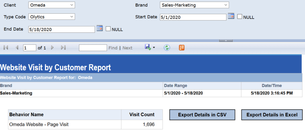 Page (1) of the report provides counts for each Olytics Field values based on the user selections of dates, behaviors:
