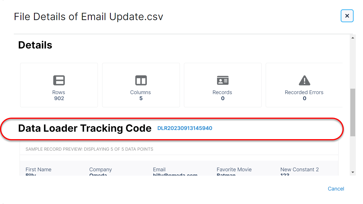 Once a file has been processed and has a status of “Complete” or “Complete with Errors”, the View Details modal will also contain the Data Loader Tracking Code.