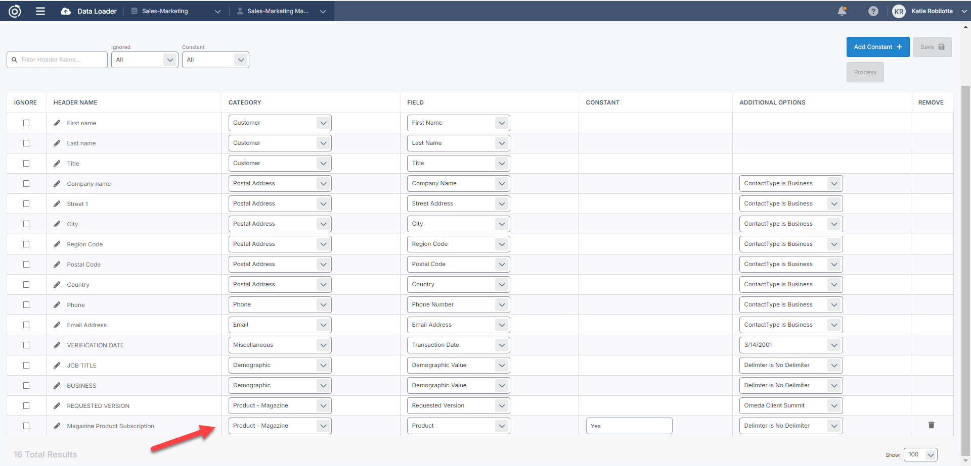 After uploading your file or creating your template, you will notice an option in the Category drop down called Product - Magazine. Just like the Product - Newsletter option, this will allow you to map magazine product, requested version for that product, and quantity. If you do not have the product included in the file, it is important to create a constant in this step for the magazine product to ensure the incoming data is mapped to the desired magazine product.