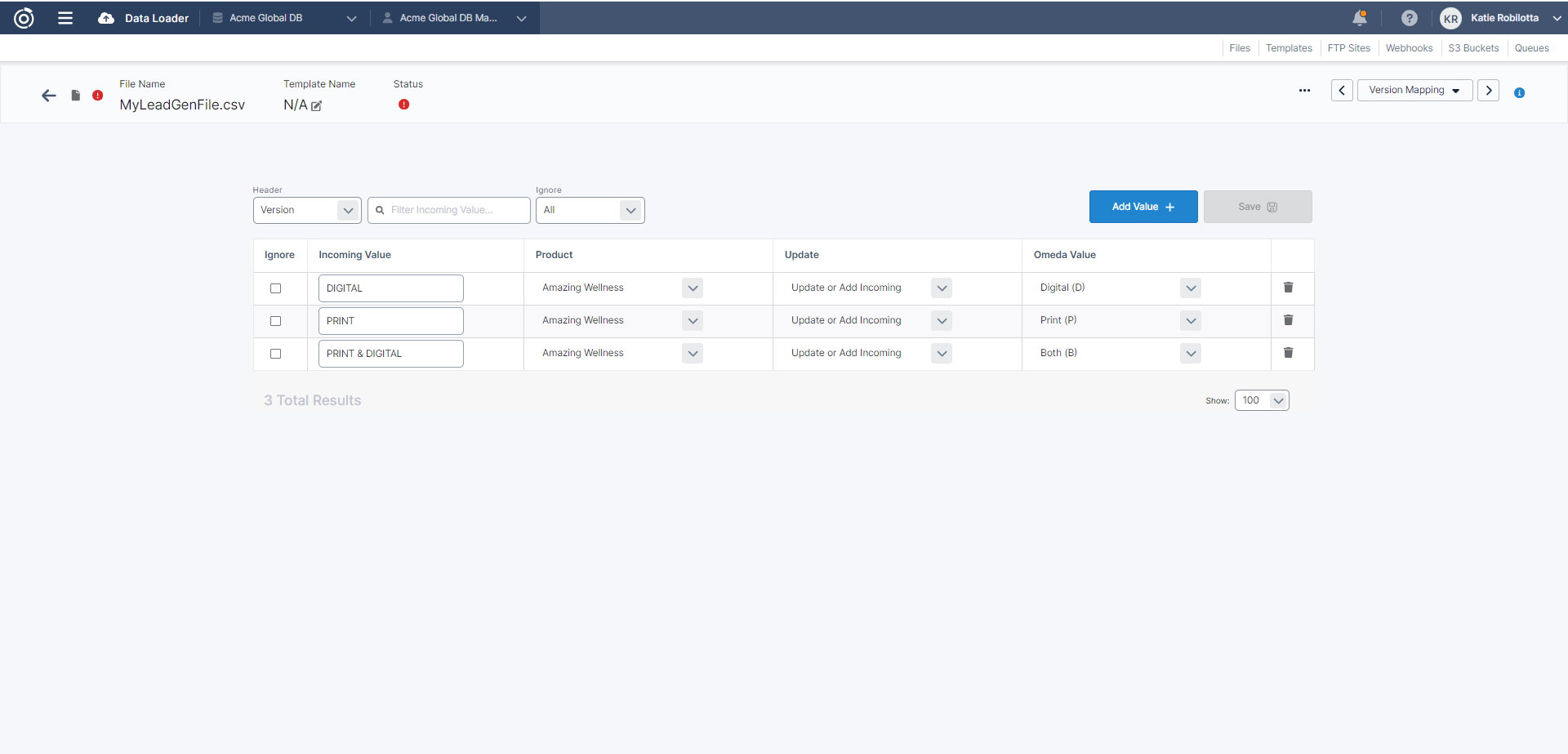 The Version Mapping step allows you to map the incoming values for the Requested Version field for a Magazine product to Omeda’s defined values.