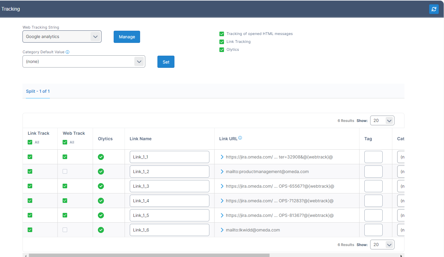 Once a URL is tagged, you can have the system automatically apply the same values every time the URL appears in a deployment. This function can be turned on and off within Email Builder (Omail). Access the Deployment Defaults and you will see a prompt for “Reuse Link Category” at all 3 levels of defaults.