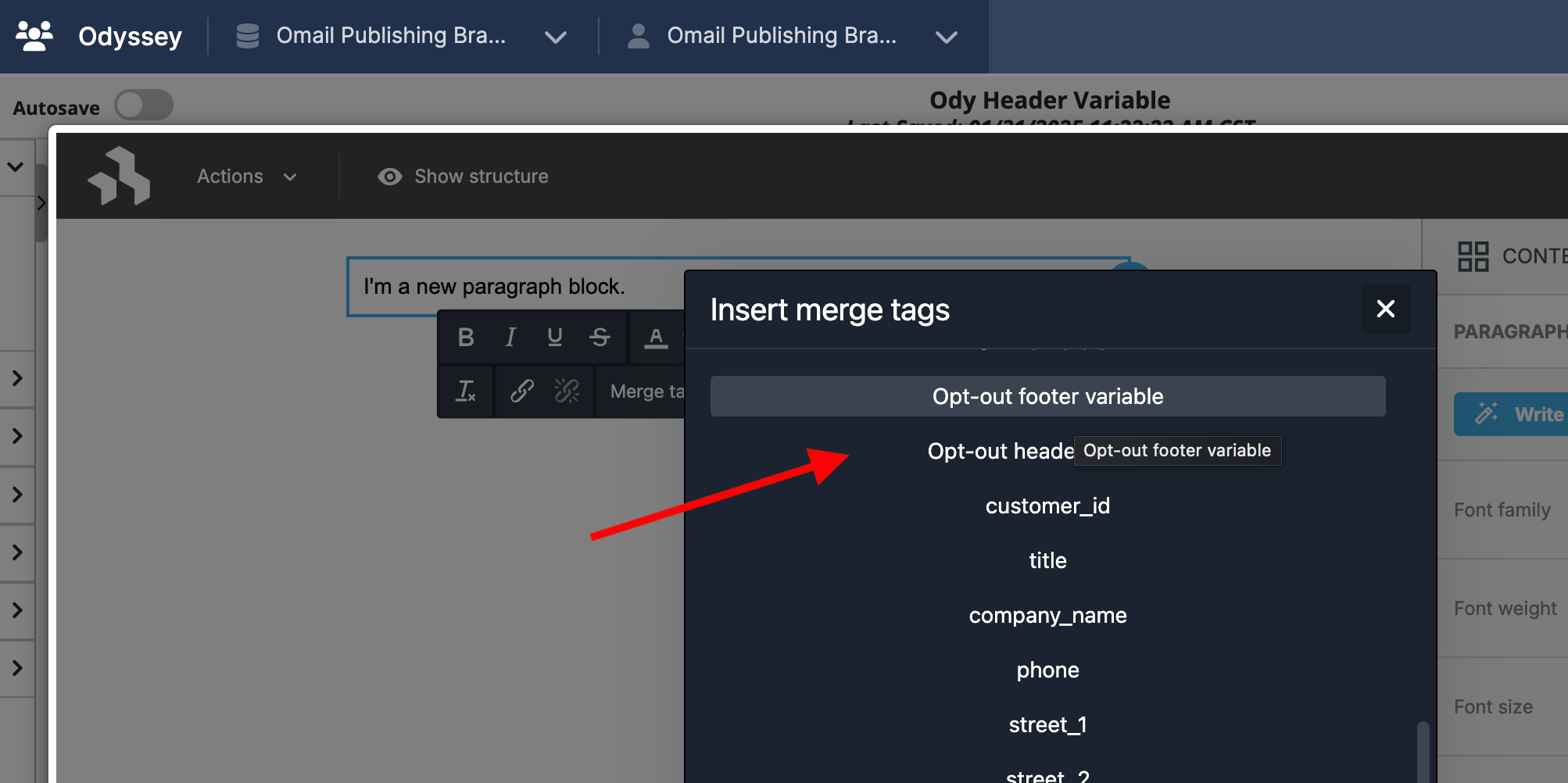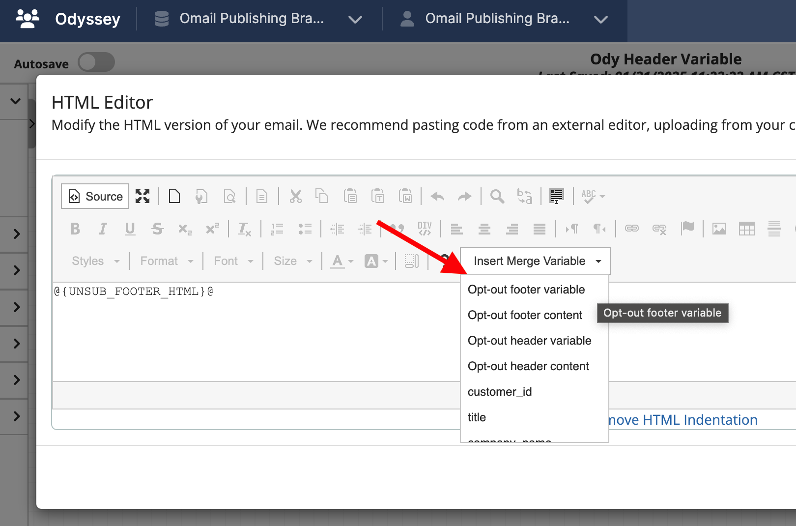 We’ve introduced merge variables for opt-out header and footer content in Odyssey’s Email Element in the Designer and HTML editor. When inserted, these placeholders dynamically resolve to the default opt-out content during test sends, previews, and live sends, ensuring consistent messaging across campaigns. In addition, the HTML editor now has the ability to use the footer/header content inserter.