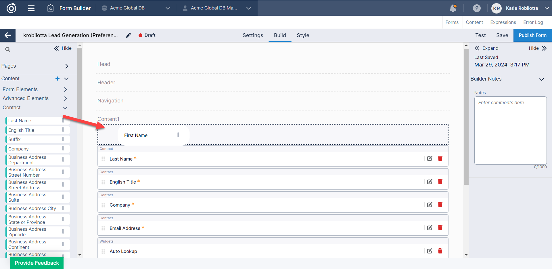 To add an element to the form, after finding it in the left panel, click and hold the element and drag it into the appropriate content box in the canvas.