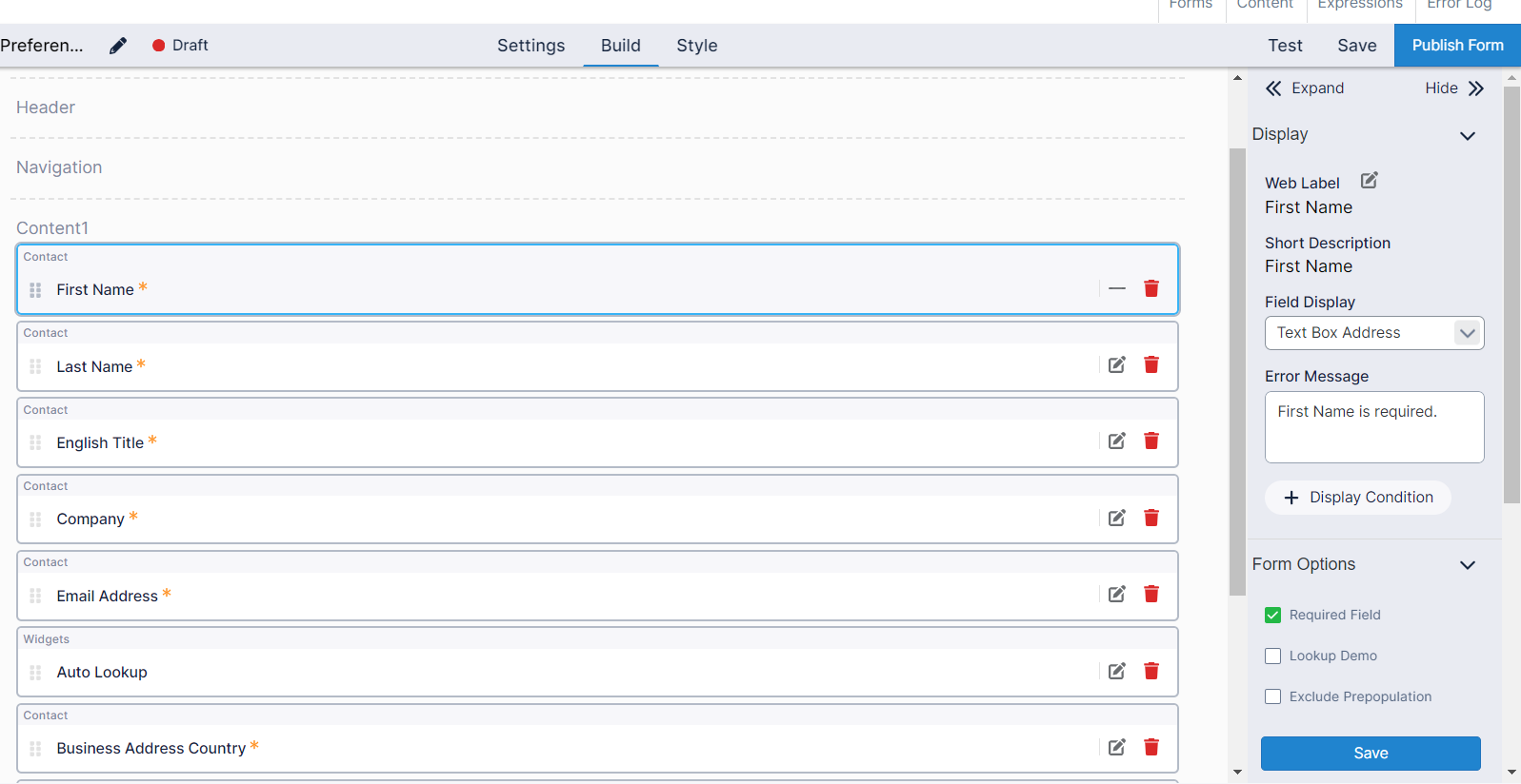 The Builder is where you will drag the elements on to build your form. Here you can organize the elements, edit them, make them required, conditionally display individual elements and much more.