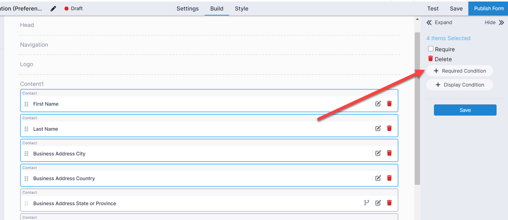 To Require, Delete, Conditionally Display, or Conditionally require multiple elements at once, select all elements on the canvas you want to edit by selecting one and pressing ctrl or shift to select the rest. The right panel will display the Require, Delete, Required Condition, and Display Condition which once selected and saved, all elements will be updated with the edit made.
