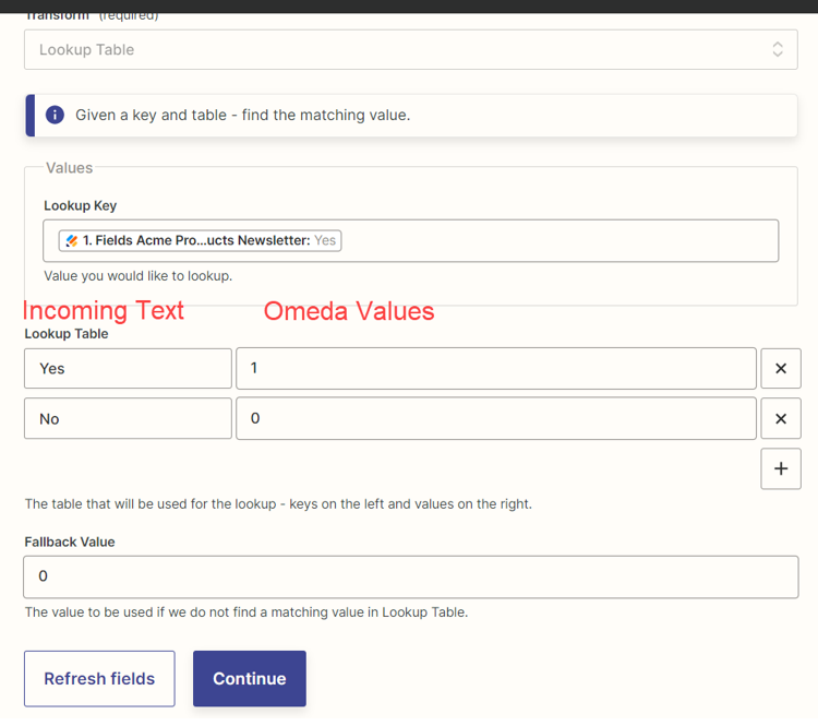 In the Lookup Table, the first column is where you enter the incoming text from the Trigger app. The second column should be where you map the Omeda Values to the incoming text.