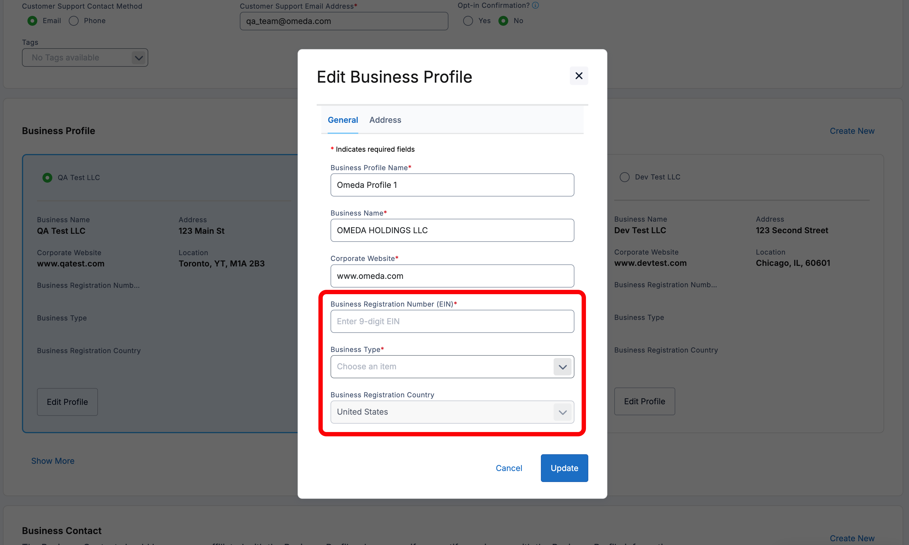 To align with upcoming industry requirements, we’re updating the process for requesting SMS numbers. A new field for your EIN in the business profile section of Message Types will now be required, along with Business Type & Registration Country.