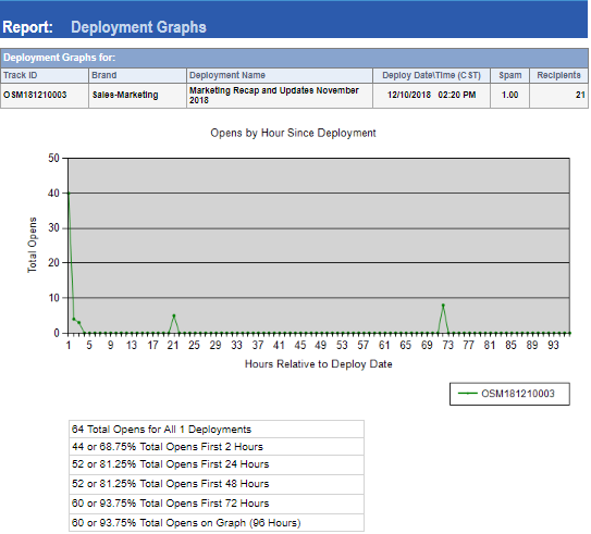This option will show you Opens by Hour Since Deployment data/graph on page 1 and the Clicks by Hour Since Deployment data/graph on page 2. This graph tracks the Opens and the Clicks, by hour, for 96 hours. This report is extremely helpful when analyzing exactly how long the engagement lasts with each particular send. This report is also helpful when testing different send times. First, run the combined report (see above) over the deployments you would like to analyze – the graph will overlay each send and easily allow you to review the data points where the most opens and clicks occur.