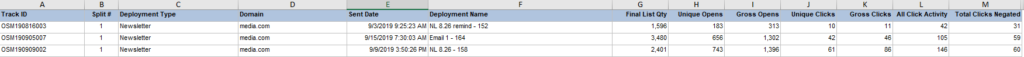 Final List Qty, Unique Opens, Gross Opens, Unique Clicks and Gross Clicks – these numbers mimic the deployment delivery report statistics.