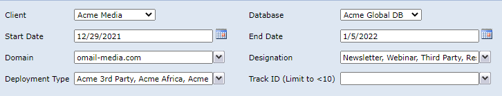 This report is based on individual email addresses (not customers) and will show the total # of emails received for each email address for the date(s) that you select to run the report. Simply narrow down the selection criteria that you desire by specifying date ranges, sending domains, deployment types, and designation.