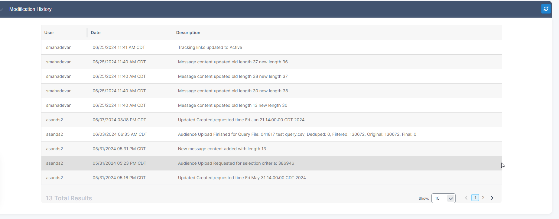 Similar to Email Builder & Odyssey, user modification logs will be recorded in the Modification History pleat.