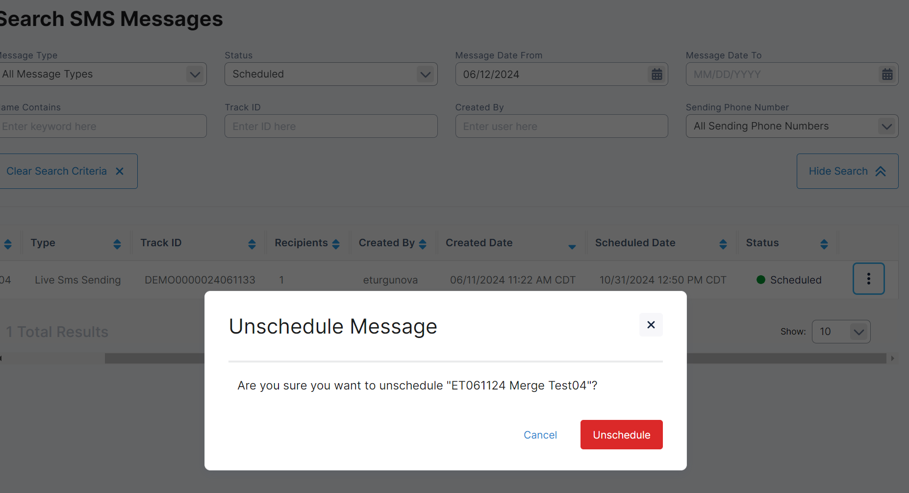 Unschedule – the message can be unscheduled. Users can unschedule messages in Scheduled status.